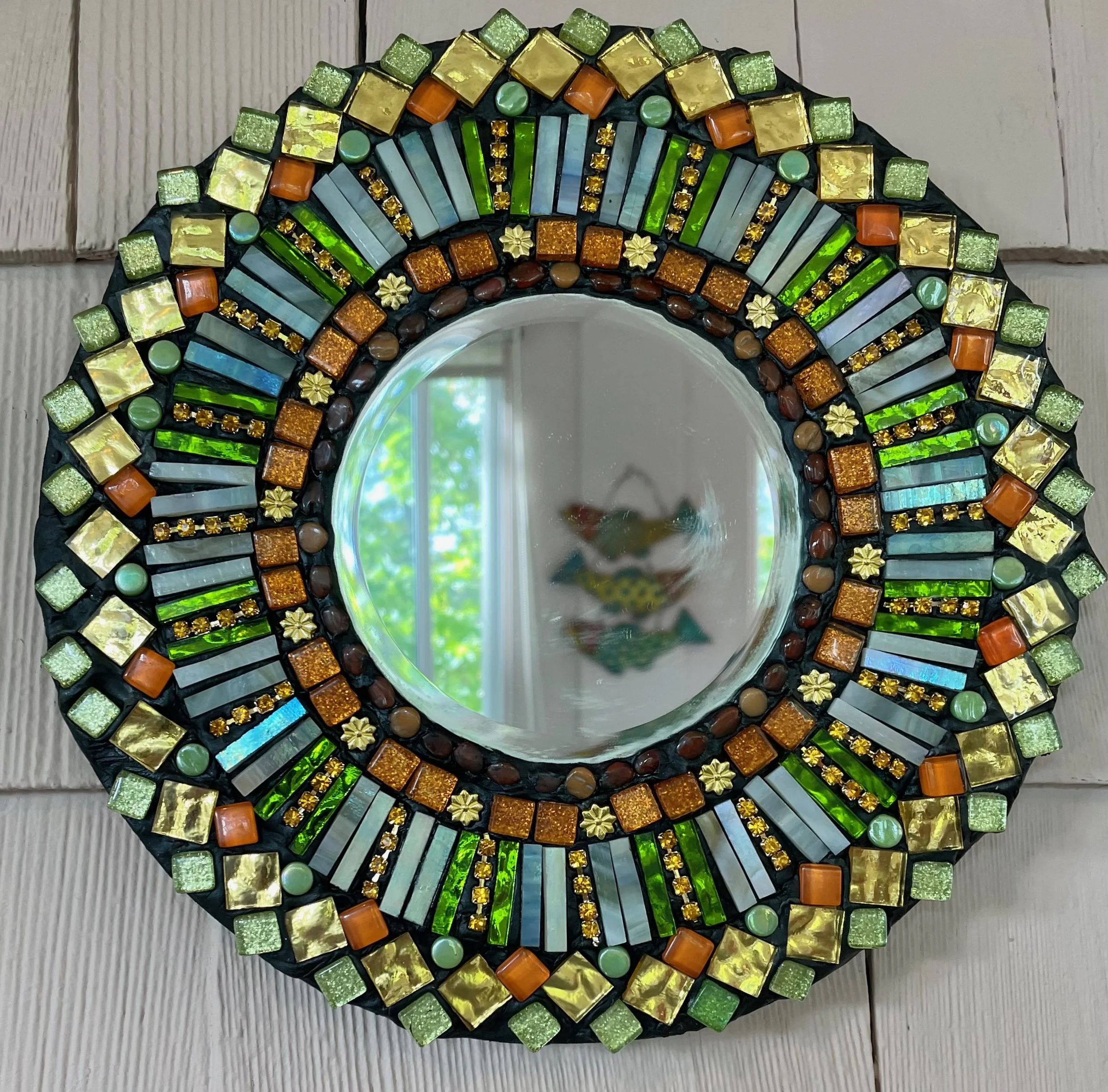 In this one day hands-on workshop, you will learn how to design a beautiful round mosaic mirror. You’ll create intricate and simple patterns using the richness of millefiori, beads, recycled jewelry and glass. The possibilities are endless. You’ll also learn about the benefits of using apoxy sculpt as an adhesive (no grouting!) as well as the some of the basics of color and design theory.